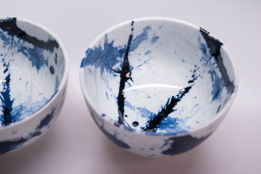 Bowl Set 2pcs with Chopsticks Blue White Splash Design