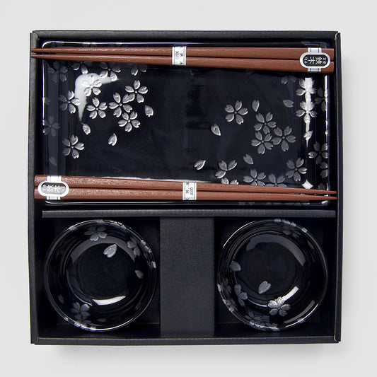 Sushi Set for Two with Chopsticks Black Sakura Design
