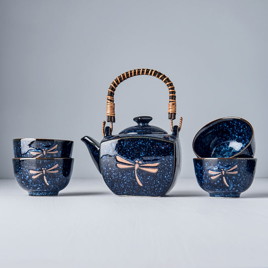 Tea Set with Strainer 5pcs Dark Blue Dragonfly Design