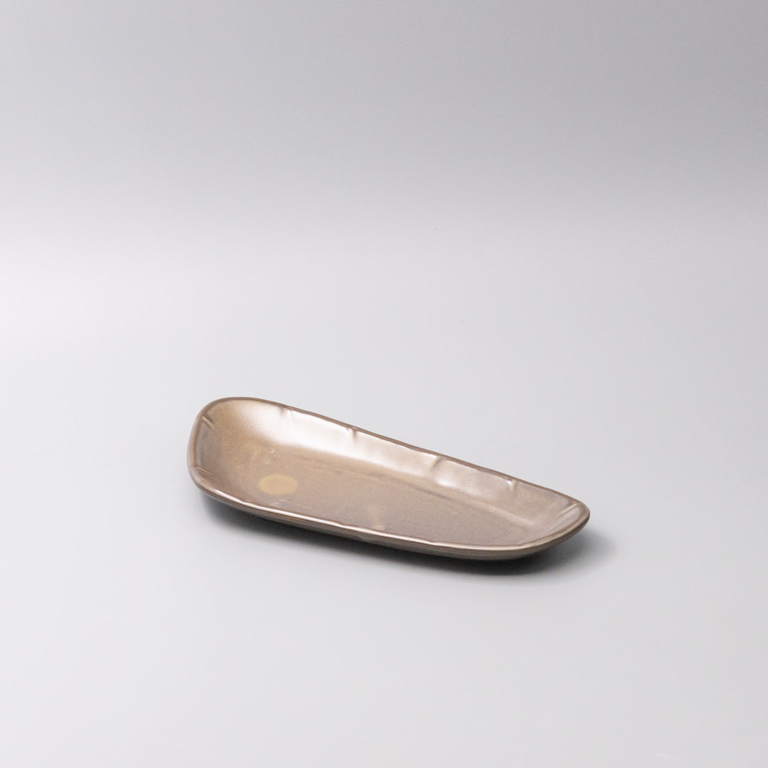 Handcrafted in Japan, this asymmetrical triangular ceramic plate brings a refined, modern touch to sushi, appetizers, and small dishes with its organic form and artisan finish.