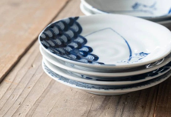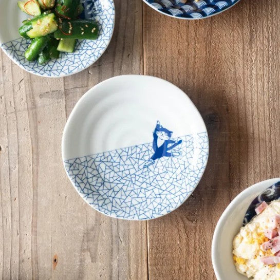 A stray cat wandered into a Mino ware pottery studio on Tanabata, the Star Festival celebrated on the seventh day of the seventh month. Seen as a sign of good fortune, the potters named the cat “Shichita.” This moment inspired the Shichita series, which combines relaxed cat characters with traditional Japanese patterns for a design that feels both playful and timeless.